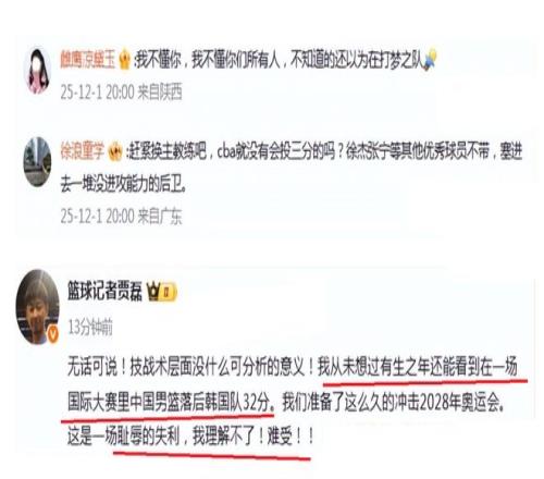 CBA记者贾磊,看到中国男篮的表现,也是十分难受,表示完全接受不了这样一个结果,这就是一场耻辱性的失利,太让人失望了。